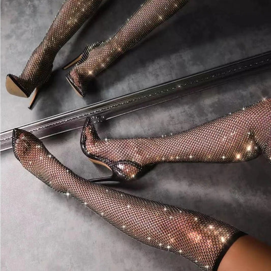 Sexy High Heel Boots Stiefel Overknee Fischernetz Sockenstiefel Slip-On 36-40.5